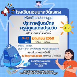 ⏱️ รับสมัครเวลา 08.30 น. – 16.00 น. ในวันและเวลาราชการ ณ โรงเรียนอนุบาลวัดเพลง 🏫