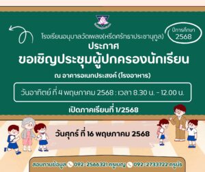 โรงเรียนอนุบาลวัดเพลง ขอเชิญประชุมผู้ปกครองนักเรียน ปีการศึกษา 2568